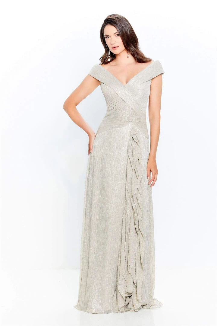 Revel in the stunning opulence of this Montage by Mon Cheri 219975 creation. Defined with visual texture on its surplice novelty stretch fabric, this red carpet ensemble shows a wide v-neckline with a portrait collar and cap sleeves. Subtly scooped at the back, this beauty is accented with a dropped waist and a cascading ruffle that traverse down its full-length hem and train. Look arresting in this lavish Montage by Mon Cheri masterpiece. Dress is pictured in Gunmetal, Bronze, Black and Champagne colors.