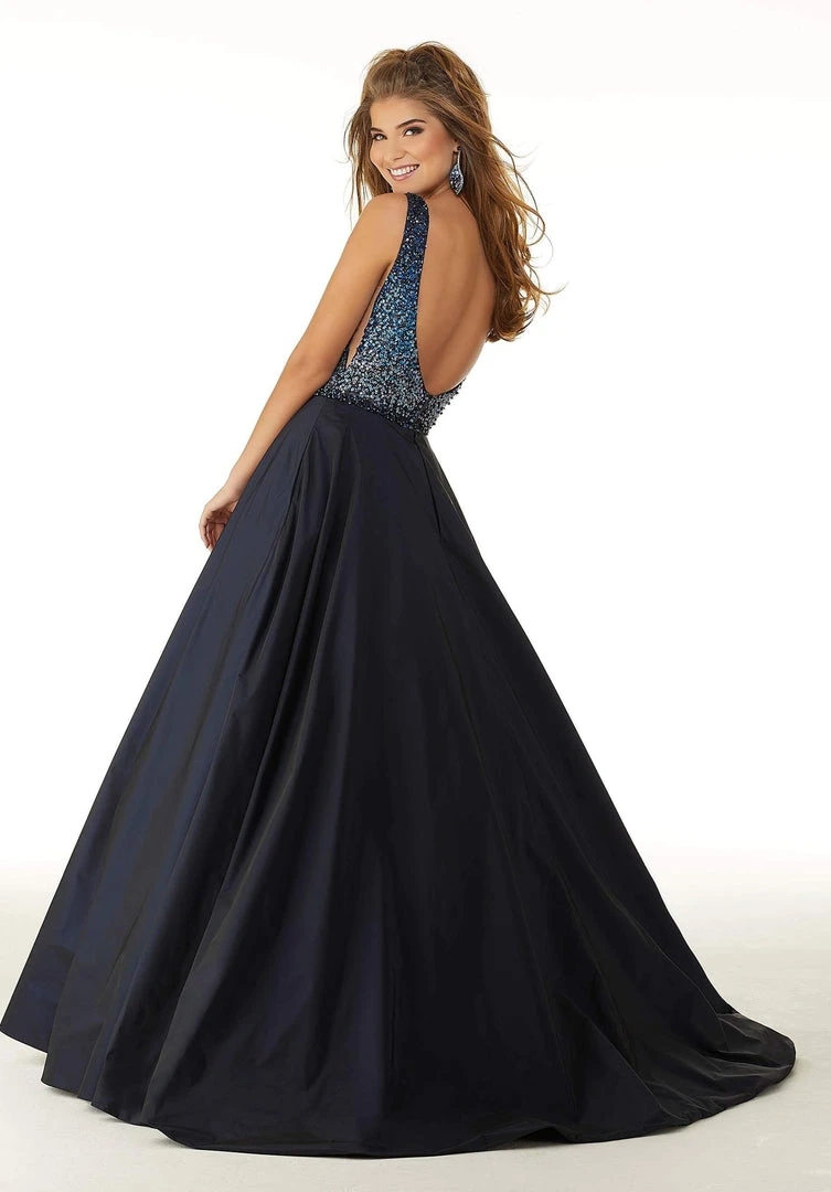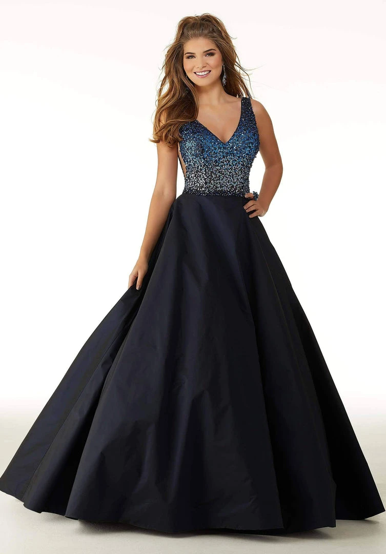 Step out in style wearing this glamorous Mori Lee 45037 masterpiece. The fitted bodice is designed in contrasting ombre shaded bead work and features a V neckline and sheer side panels. The full a line long skirt is crafted in taffeta with side pockets, completed with a sweep train. Walk in glamour and let all heads turn on you in this creation by Mori Lee.