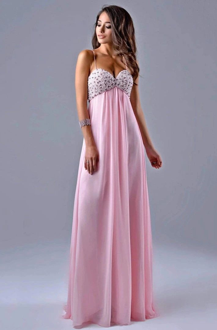 Spaghetti strap, pearl and rhinestone embellished sweetheart bodice. Flowing long chiffon skirt.