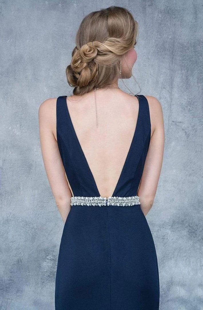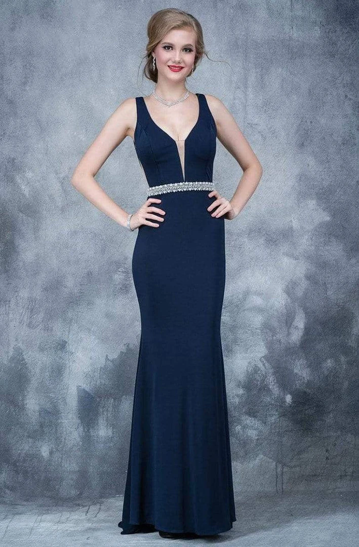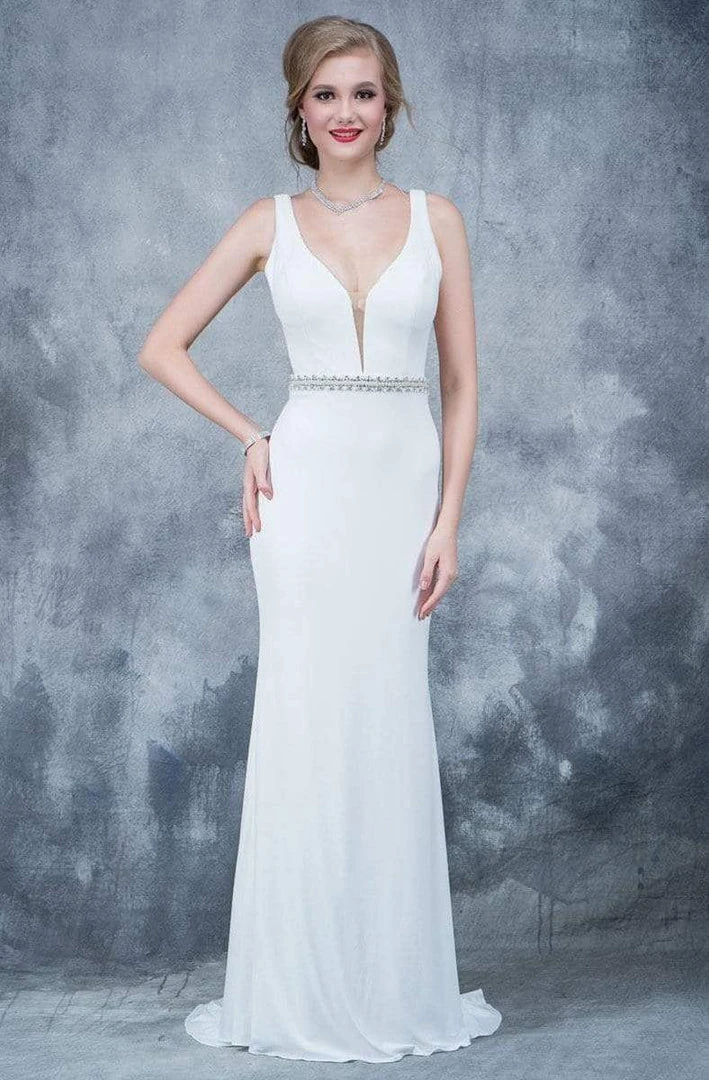 Celebrate your newly found goddess-inspired look when you slip on this stunning Nina Canacci 2124 creation. Fashioned with seams for that appealing figure-flattering shape, this stunner flaunts a sleeveless bodice topped with a plunging v-neckline and an illusion modesty inset. Sheer panels are festooned at both sides of the bodice as an alluringly low v-cut style graces the back. Crowned with shimmering jewels that embraces the waist in opulence, the sheath skirt skims unerringly down to a lush full-length hem and a sweep of train. Be a beauty from all angles as you exude charm in this Nina Canacci masterpiece.