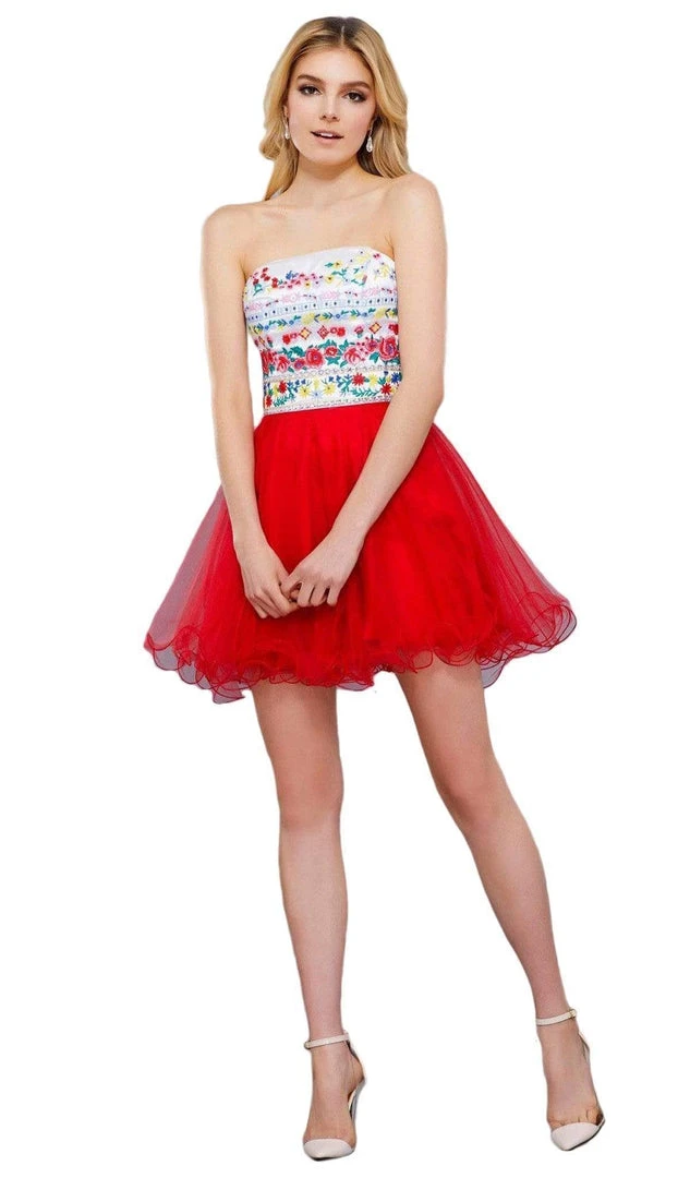 | Details: | Strapless Straight Neckline, Embroidered Bodice, Low Open Back with Corset Lace Detail, Ruffled A-line Short Skirt, 100&% Polyester and Tulle, Back Zipper |