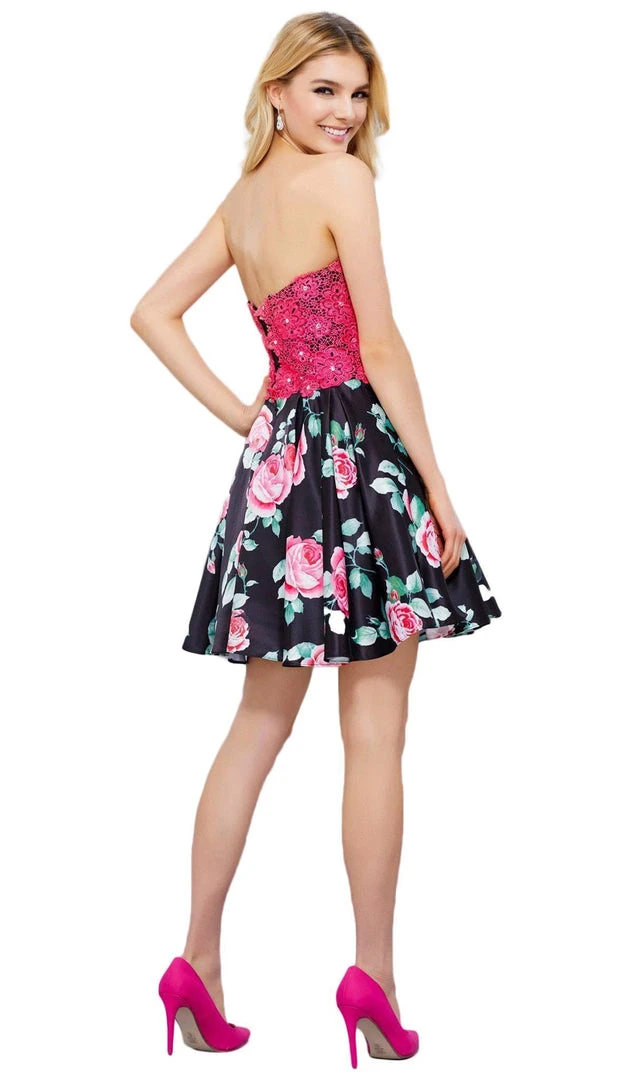Get used to the vibrant flash of the spotlight when donned with this elaborately embellished Nox Anabel 6270 jewel. This delicate stunner boasts of a stunning sweetheart neckline and a sassy corset-laced open back. The from-sculpted bodice flaunts of a rhinestone-peppered floral lace treatment. Nipped at the waist with a band that diverts the eyes to a flurry of pleated floral print fabric that ends in a short hem. Look your best at every special occasion in this glamorous floral Nox Anabel wonder.