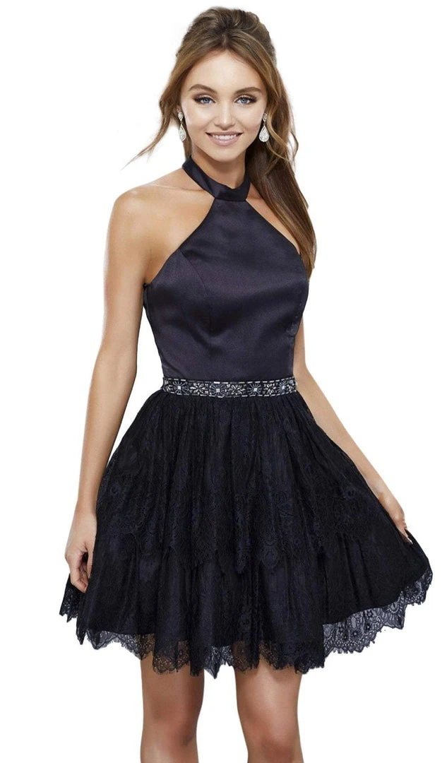 Look sophisticated and classy under the star-strewn night with this dress by Nox Anabel 6348. This short ensemble features a sleeveless bodice highlighted with a sleek halter neckline with an alluring mid-open back. The waist is embellished with a beaded belt and gives way to a short A-line skirt accented with tiers of lace and scalloped hemline. This Nox Anabel dress creates a fun and exciting look.