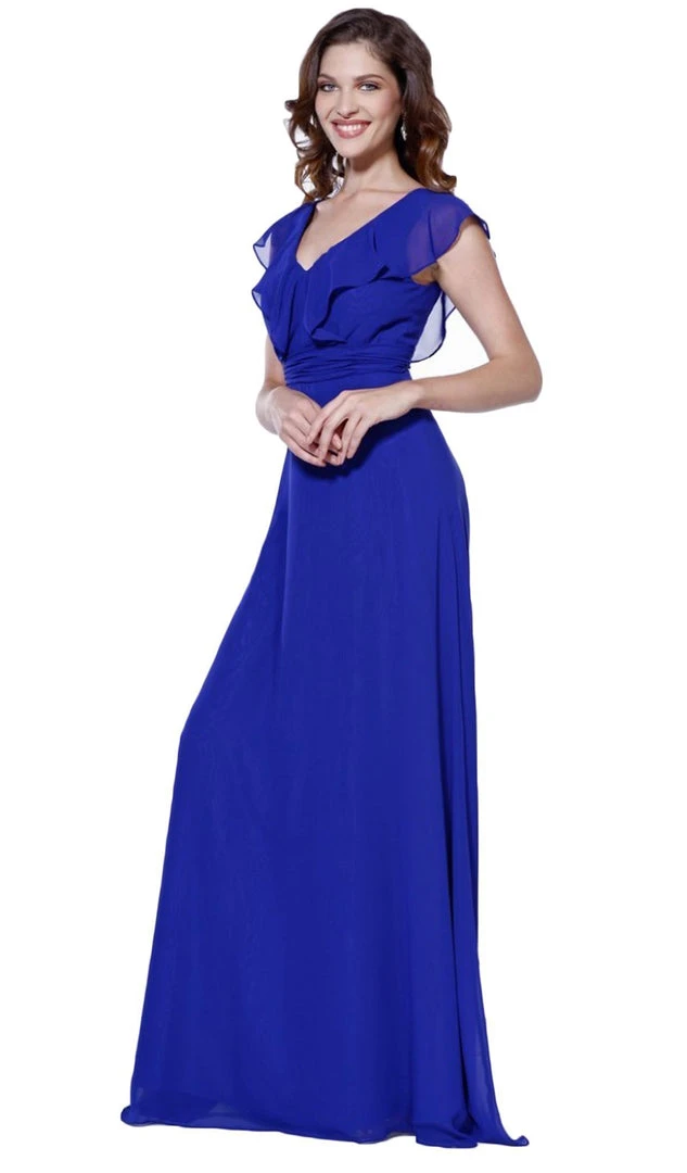 Distinguish yourself in feminine beauty and poise in this flowing Nox Anabel 7123 creation. Ornate with delicate ruffled chiffon flaunting the bodice, this exquisite piece displays a v-neckline, sheer butterfly sleeves and a v-shaped open back. Cinched with a finely-tucked band, the sheer overlaid A-line skirt streams down to a full-length hem. Elegantly glide into any party in this magnificent Nox Anabel masterpiece.