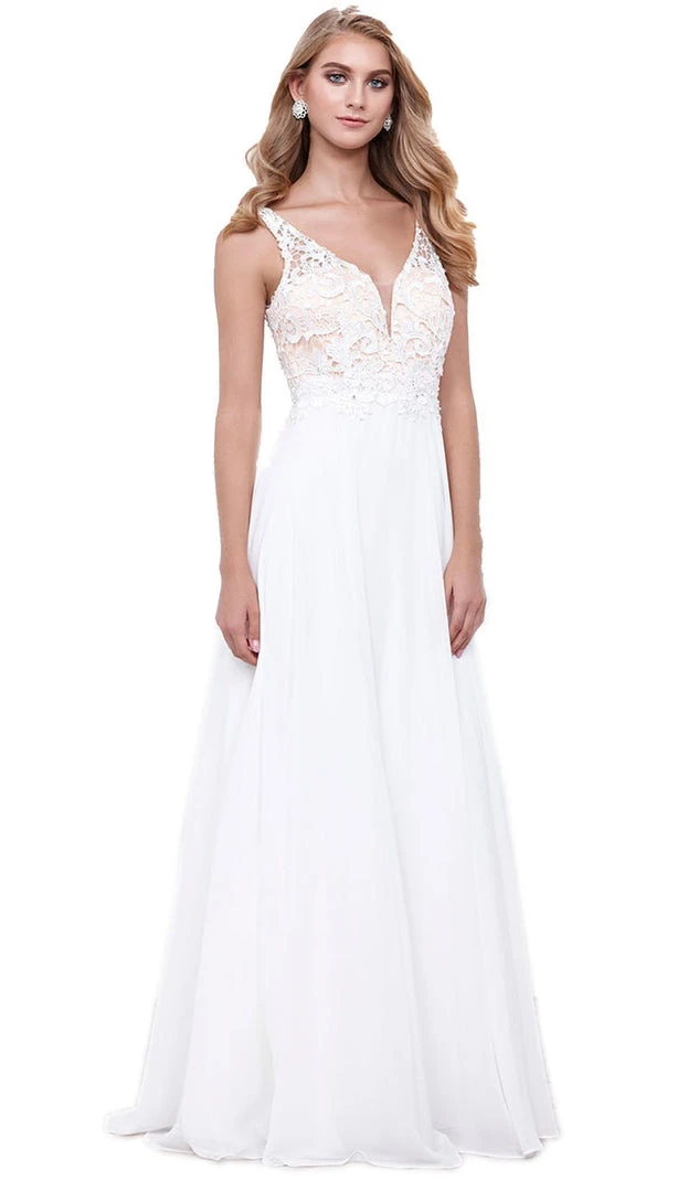 Stand out in this elegant long Nox Anabel 8297 creation. Features sleeveless laced bodice over sheer panel that beautifully highlights the V-neckline with a sheer modesty inset and a scoop open back. Full length layered and finely gathered chiffon skirt that elegantly flows to the floor with a ruffled hem. This NOx Anabel masterpiece definitely parades elegance and classy style.