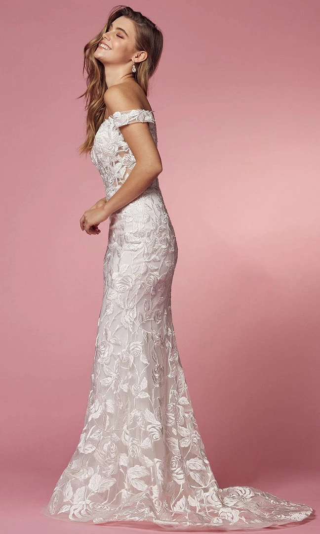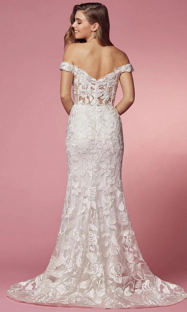 Dare to show off your stellar style on your wedding day in this Nox Anabel Bridal C439W creation. Festooned with intricate floral embroidered details on a sheer tulle bodice, this piece parades an off shoulder neckline with a v-neck plunge. Detailed with a sheer corset bodice that rhymes with its illusion v-open back. The floral adorned mermaid skirt flows into a sweep of train. Leave them astounded in this Nox Anabel Bridal masterpiece. This stunning collection of Nox Anabel dresses will reflect your personality and give you an elegant red-carpet look. Model is wearing the White color.