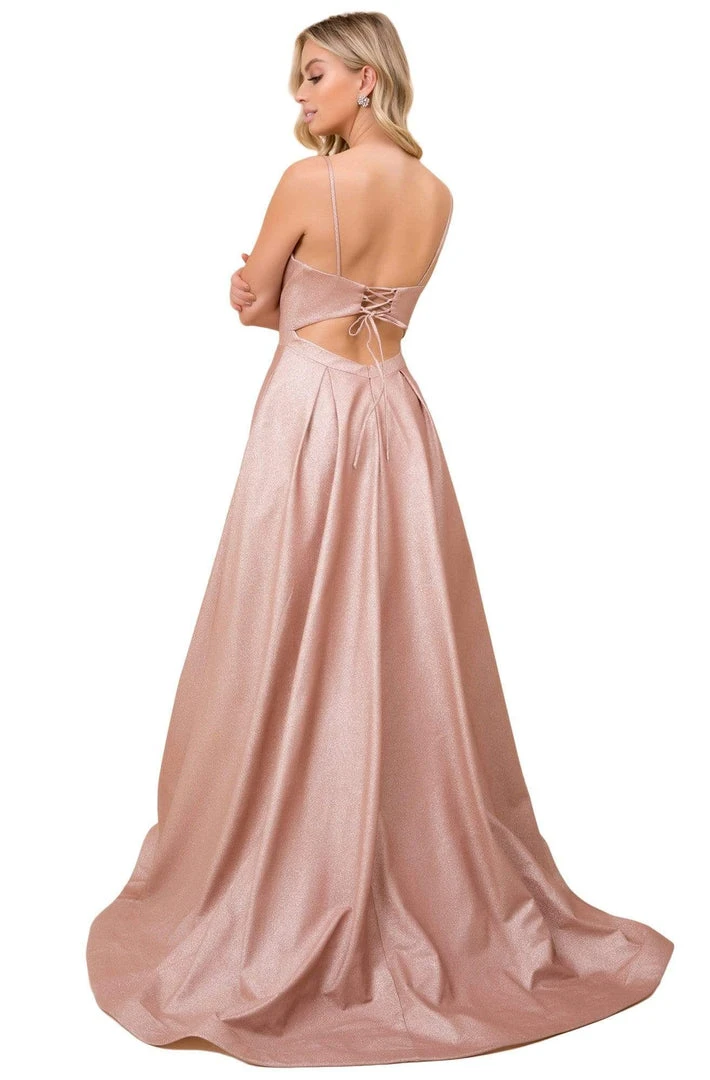 Bring on that queenly confidence to the Prom wearing this lavish gown from Nox Anabel E379. This metallic glitter knit gown flashes in a sleeveless, illusion plunging V-neckline with thin straps holding the seam sculpted bodice. The back has lace-up ties on the bandeau strap and a cutout leading to the voluminous ballgown skirt that opens up with a high leg slit. Turn yourself into a royalty in this creation by Nox Anabel.