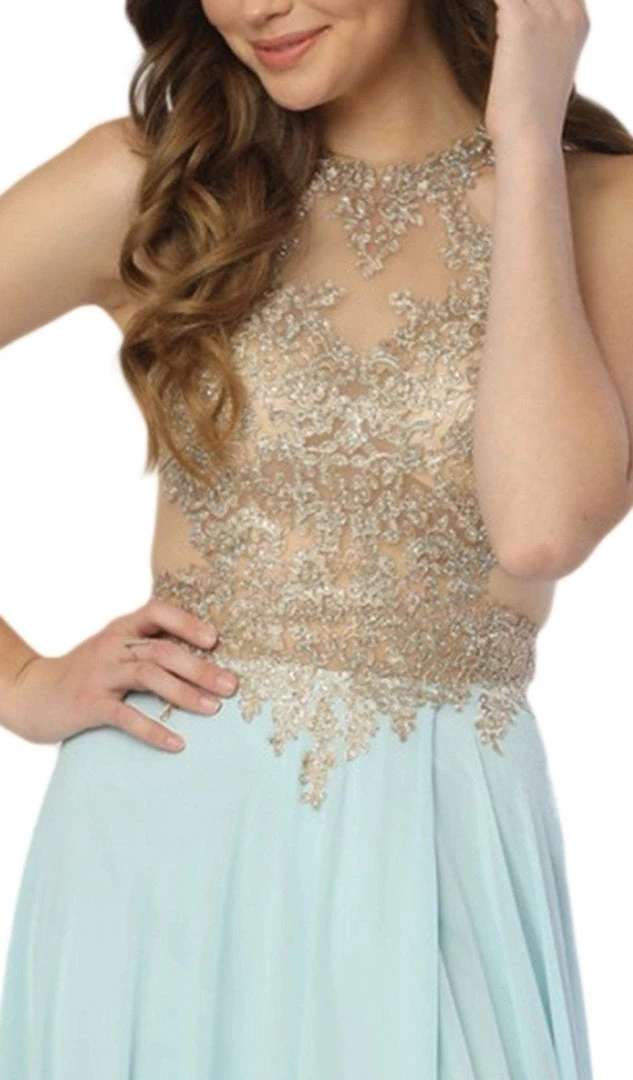 Surround yourself with sparkle of glamour when you walk in this dazzling dress from Nox Anabel S202. Presents a sleeveless, gilded halter neckline with a sexy open back. The back has a zipper closure and from the waist begins a full length A-line skirt with a high slit. Capture the glamour as you walk on this stunning Nox Anabel dress.