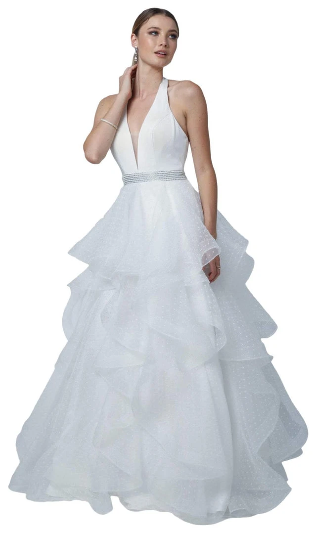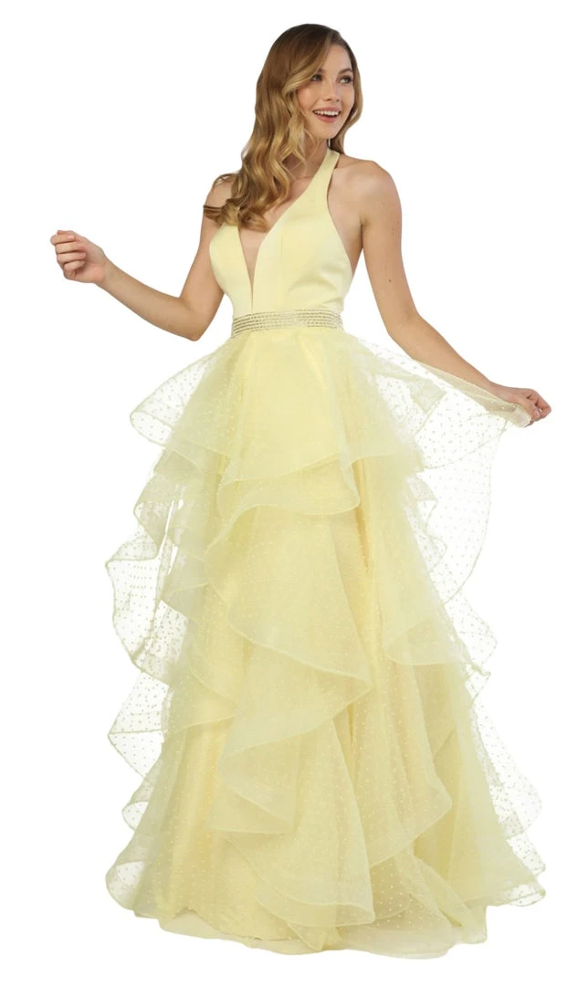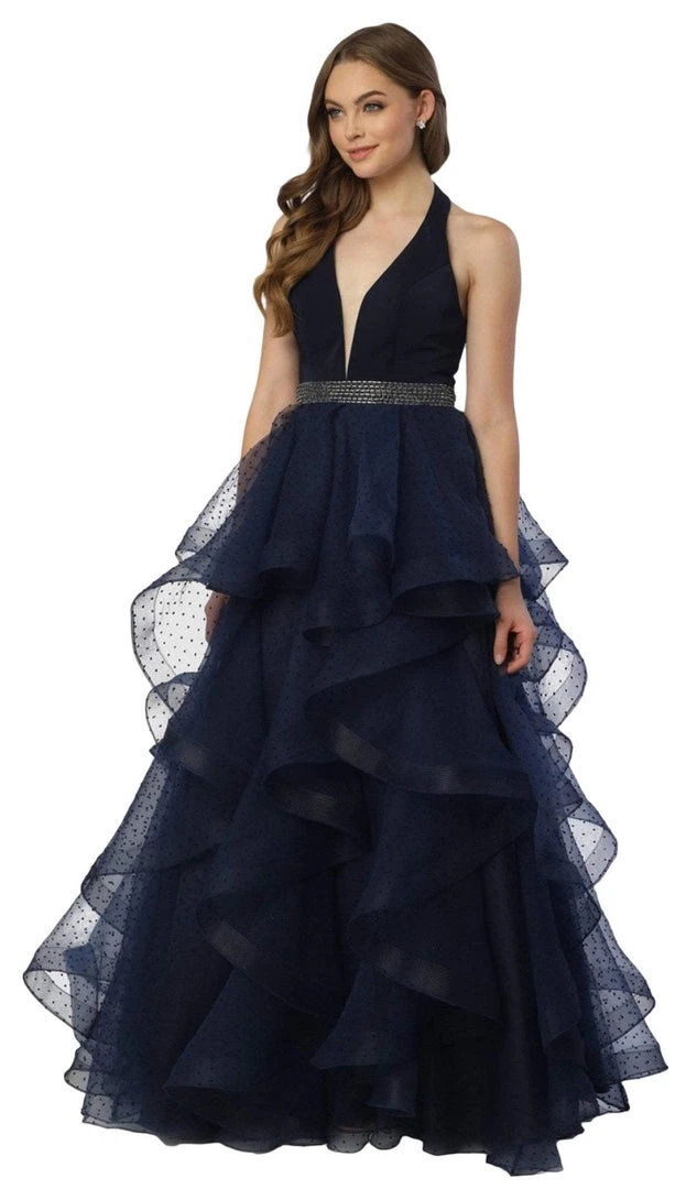 Nox Anabel - T256 Plunging Halter Dotted Lace Tiered Gown Formal Gowns
