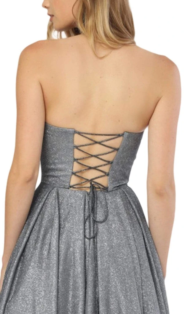 | Details: | 100% Polyester, Metallic Jersey fabric, Strapless, Lace up back, Bra cups, Fully lined, Back zipper closure |