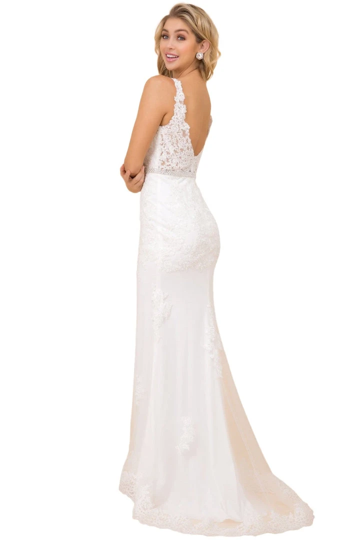 Look picture perfect in your special day in this mesmerizing Nox Anabel W907 creation. Intricately adorned with lace appliques mingling with rhinestones, this ensemble flourishes a scoop neckline over a plunging sweetheart lining. The sheer adorned back is designed with a v-style and the waist is embellished with beadwork. The sheath skirt streams into a full-length hem and a subtle train. Fall in love with the very romance of this Nox Anabel masterpiece.