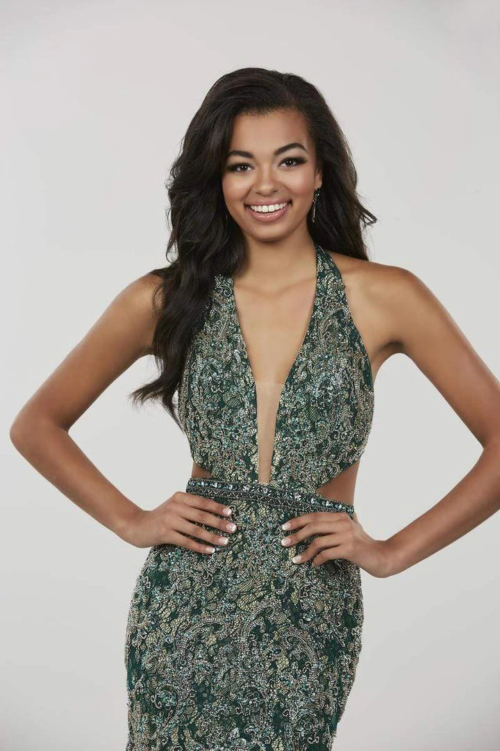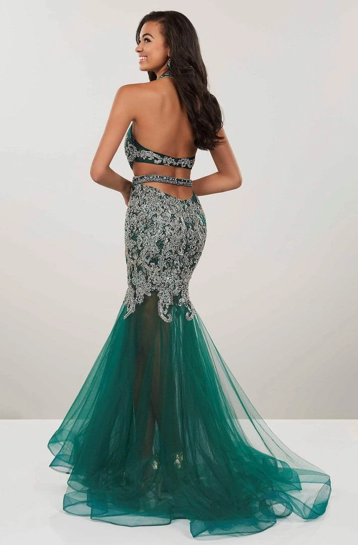 Look jaw dropping in this dramatic dress by Panoply 14964. Shows off in a sleeveless, plunging halter V-neckline with side cutouts and open back. The bodice is ornate with beaded lace while the tulle skirt flourishes a mermaid silhouette with a horsehair hemline and sweep train finish. Wow the crowd as you glide past them in this Panoply creation.