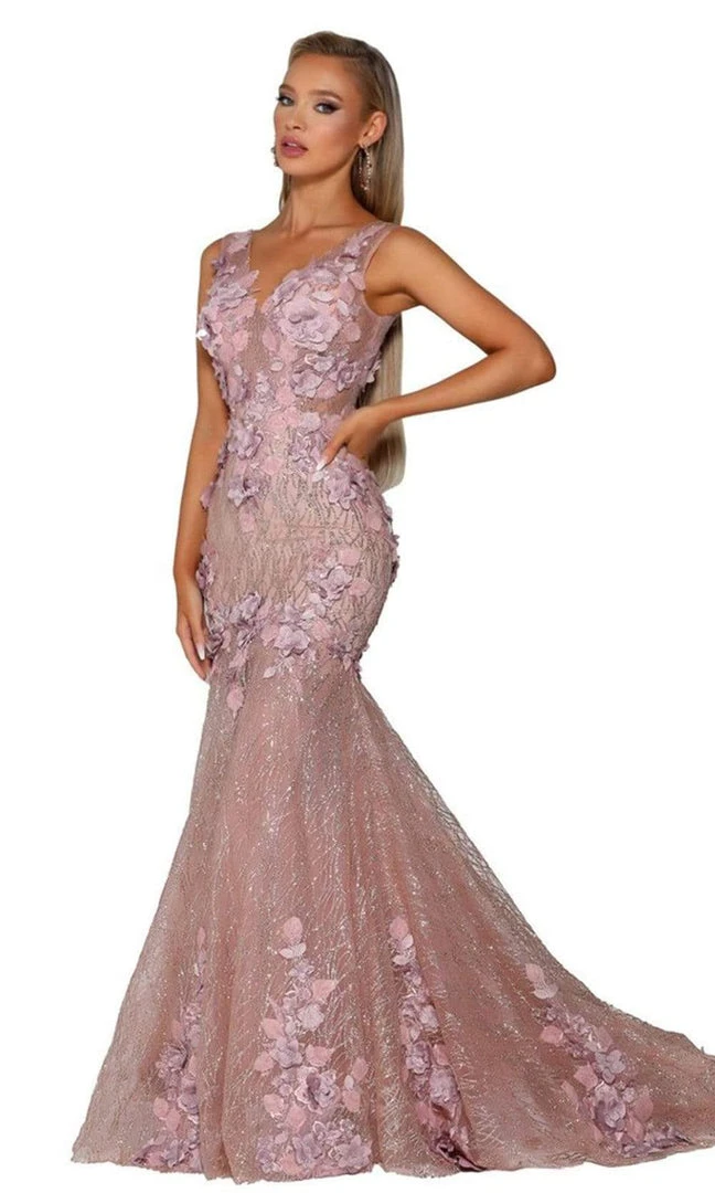 Get ready to show off your glamorous side in Portia and Scarlett PS6002. This long floral embroidered dress features a sleeveless, V-neckline with a form-fitting bodice. The skirt tapers at the thighs and flares at the bottom to a sweep train finish. Leave everyone speechless when you enter the room in this Portia and Scarlett look.