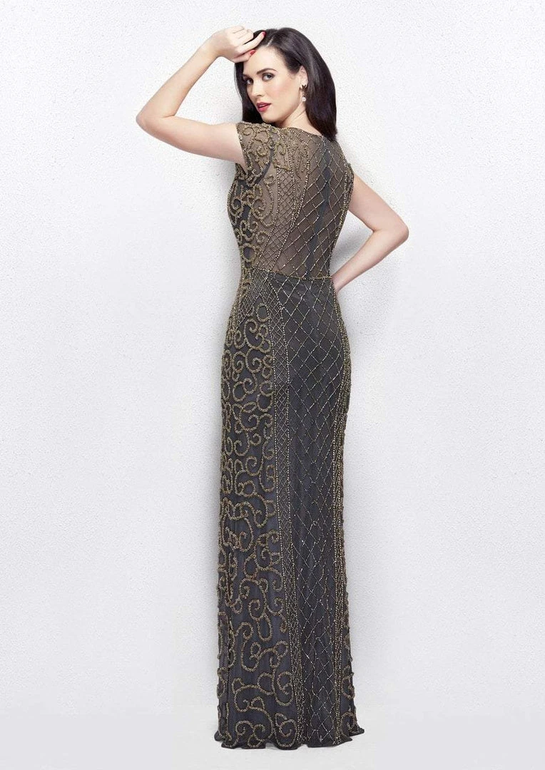 Be fabulous in this dress by Primavera Couture 1976. This dress is designed with an illusion jewel neckline that is highlighted by illusion details and gold accent scattered all over the dress. This dress features cap sleeves and a sheath skirt that looks perfectly amazing to the overall look of this stunning creation. Another great creation by Primavera Couture.