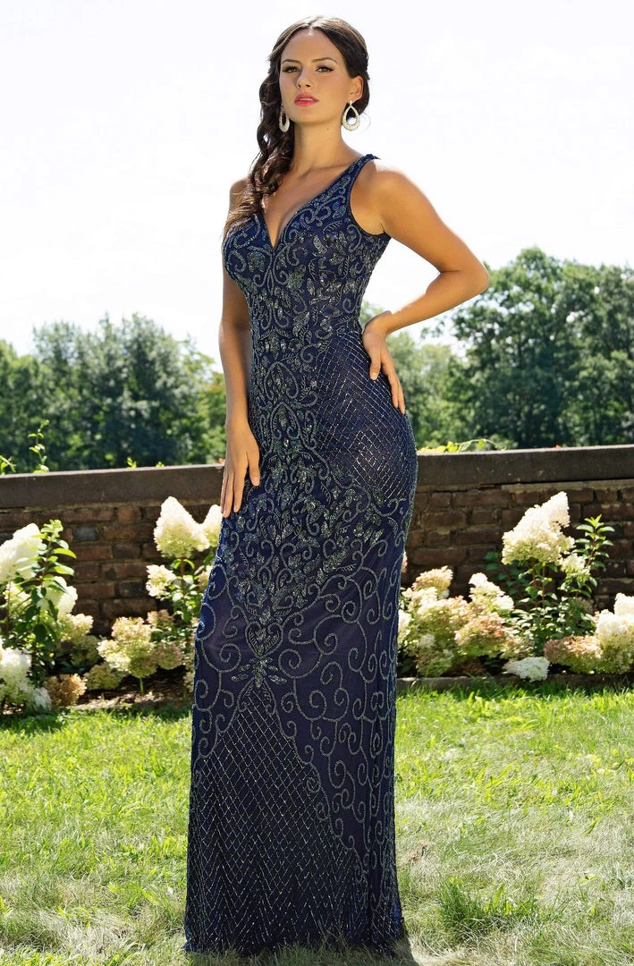 Walk in seduction and style in Primavera Couture 3232. Fashions a sleeveless, plunging V-neckline with fitted bodice adorned with glittering embellishments. The back flaunts a low scoop cut and the skirt flourishes a full length sheath skirt with a sweep train finish. Capture that striking presence and get everyones attention in Primavera Couture.