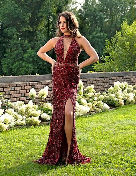 Get noticed in this radiant dress from Primavera Couture 3244. Captivates in a sleeveless, high halter neckline with front and side cutouts with sheer panel at mid-bust. The entire dress is embellished with sequins and beading. The dress shows off an open back and the fitted skirt features a high slit and sweep train finish. Leave everyone speechless when you enter the room in this Primavera Couture dress.