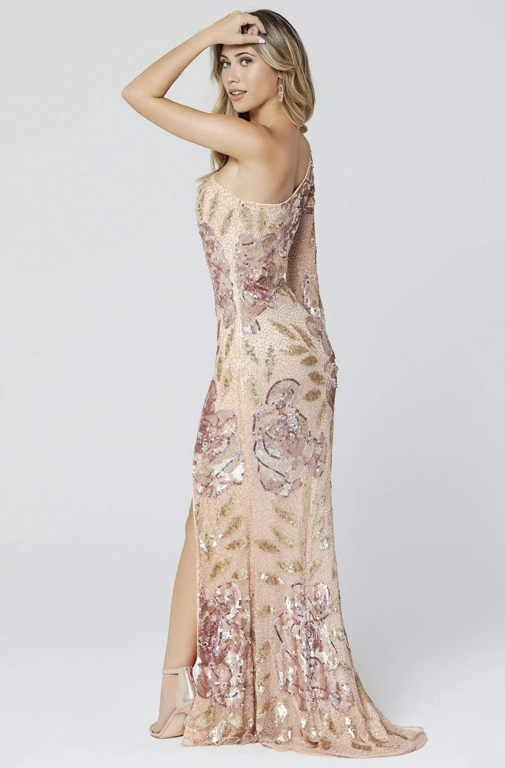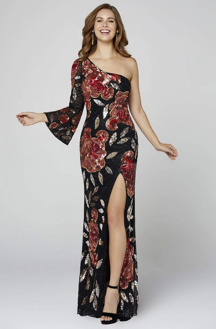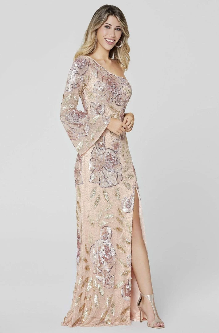 Look and feel glamorous in this Primavera Couture 3449 dress. This sequined dress envisions an asymmetric neckline with single bell sleeve. The fitted bodice flourishes a full length sheath skirt with a slit and mini train finish. Look sophisticated and mature in this simple yet chic Primavera Couture dress.