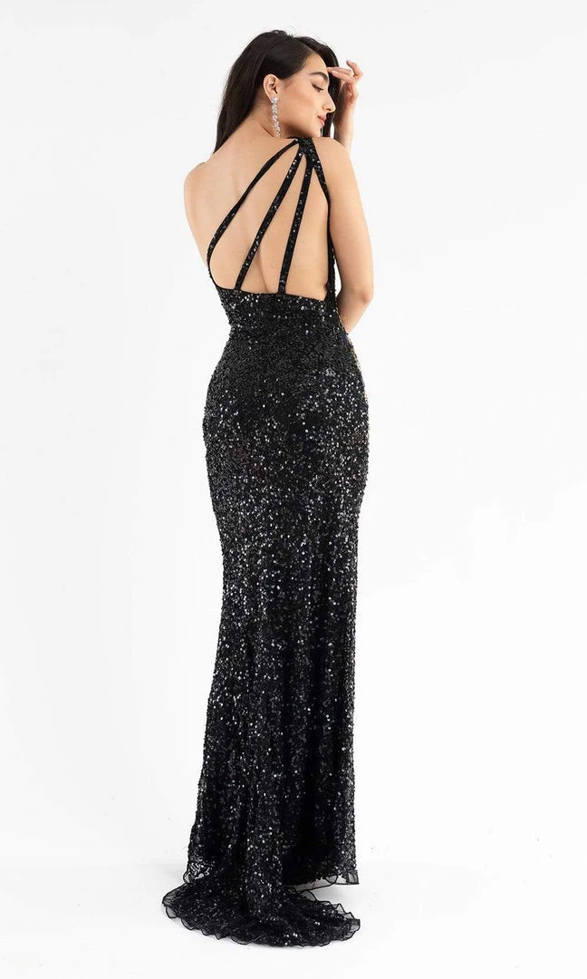 Sparkle in beauty wearing this Primavera Couture 3738. This dress has a peacock-inspired vibe due to the way it incorporates beads and sequins. It features an asymmetric neckline that is held in place by one shoulder strap and leads to an open strappy back. The skirt reveals a high slit as it touches the floor with a train. Shimmer all night long in this sophisticated Primavera Couture masterpiece. Primavera Couture’s sparkling long sequin dresses and cocktail dresses will dazzle you with compliments as these dresses are extremely impressive.