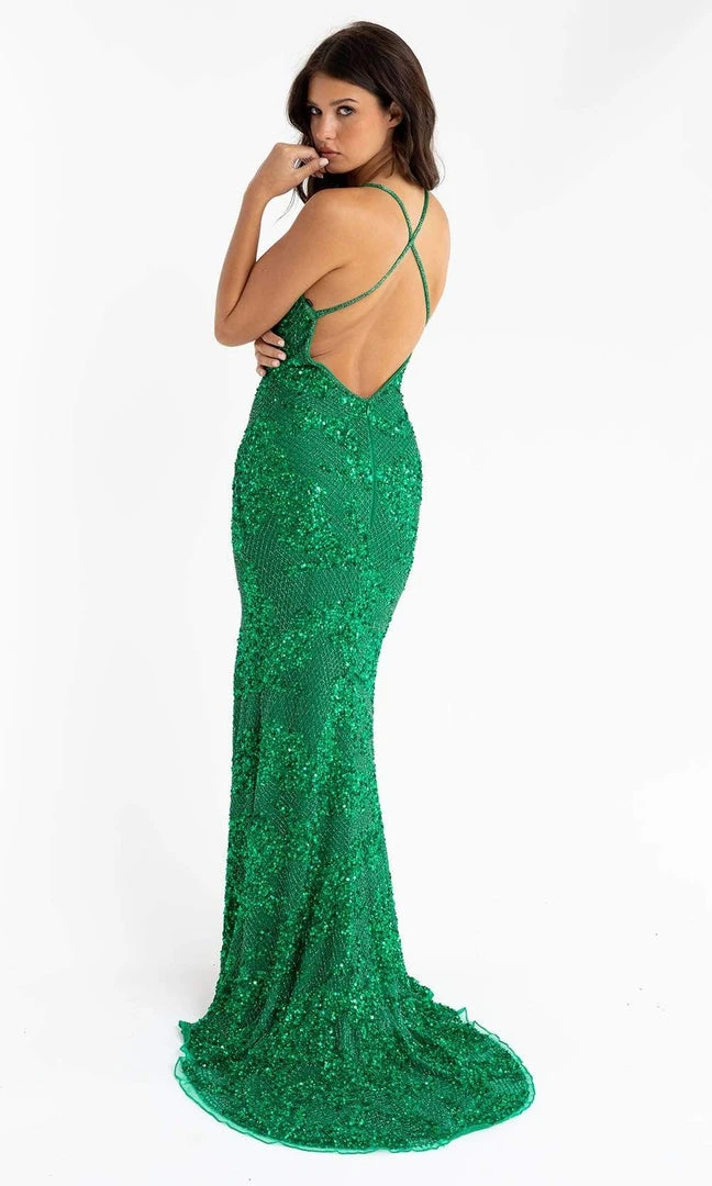 Take their breath away with this stunning Primavera Couture 3760. A fully sequin embroidered gown is perfect for you. It has V neck and a crises cross back with a sweep train that has a high slit and a back zipper closure. Radiate a fresh style as you orchestrate a dramatic entrance in this radiant Primavera Couture is sure to m Primavera Couture’s sparkling long sequin dresses and cocktail dresses will dazzle you with compliments as these dresses are extremely impressive.