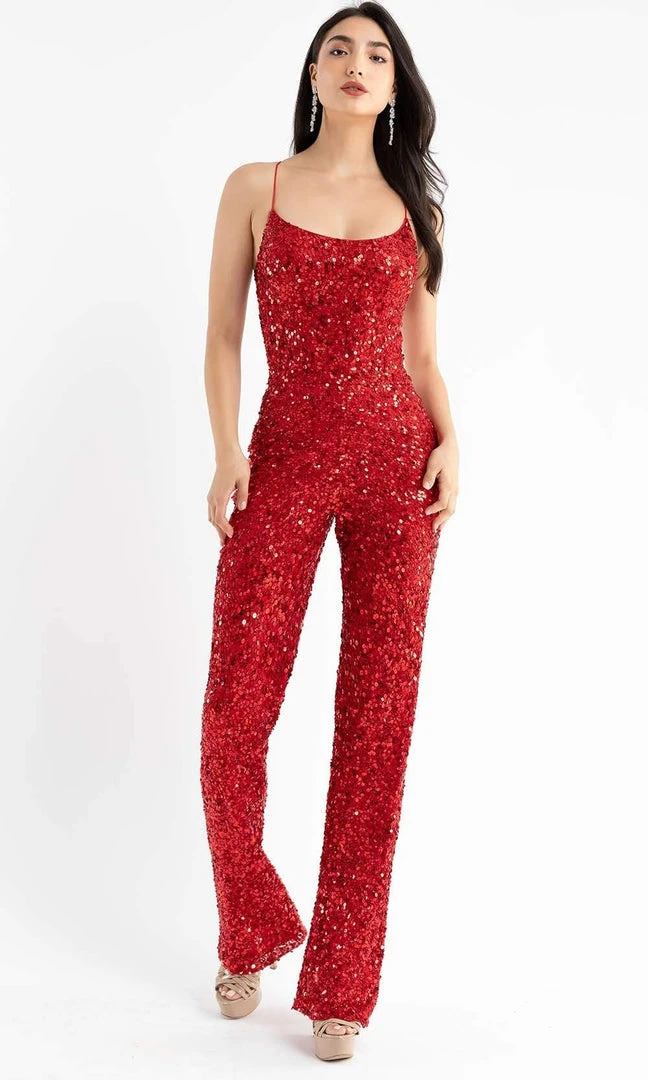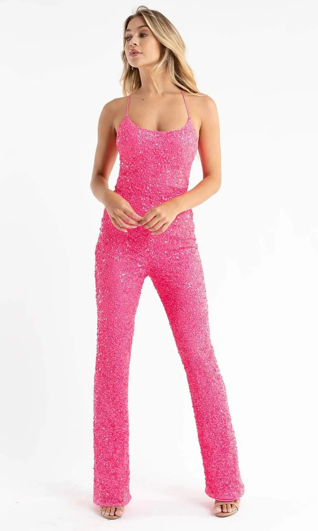 Show off your bubbly and pleasant personality with this sequin jumpsuit by Primavera Couture 3774. This gorgeous pair that has a fashionable sleeveless, scoop neckline and thin spaghetti straps that lace up and tie in the back with fitted bodice would definitely adore everyone in the crowd. This Primavera Couture is tailored to fit your curves. Primavera Couture’s sparkling long sequin dresses and cocktail dresses will dazzle you with compliments as these dresses are extremely impressive.
