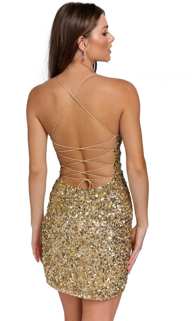 Orchestrate a spectacular evening of dazzling sophistication in this luxurious Primavera Couture 3891 masterpiece. This jaw-dropping design showcases a faux-wrap fitted bodice completely embellished in sparkling sequins. The sleeveless dress features a deep V-neckline and spaghetti straps leading to the sexy bareback that creates an adjustable lace-up tie. Flaunting a side slit for ease of movement, the skirt is sculpted in a sheath silhouette that tapers in a mid-thigh hem. Get noticed in this radiant cocktail dress from Primavera Couture. Models are wearing the Baby Pink, Blue, Black, Bright Blue, Emerald, Fushia, Gold, Ivory, Midnight, Neon Coral, Neon Lilac, Neon Pink, Neon Sage, Orange, Purple, Red, Turquoise and Yellow colors.