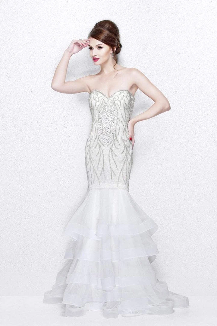 Captivate attention as you capture hearts in this glamorous Primavera Couture 1854 creation. Flaunting a splendidly ornate silhouette, this stunner features a strapless, sweetheart neckline with a sultry semi-open back. Sculpting generously from the hips down to the mid-thigh, the lavish tiered mermaid skirt flourishes as it courses down and completes in a full-length horsehair-trimmed hem. Be a timeless beauty in this gorgeous piece by Primavera Couture. Model is wearing the Ivory, Burgundy and Midnight colors.