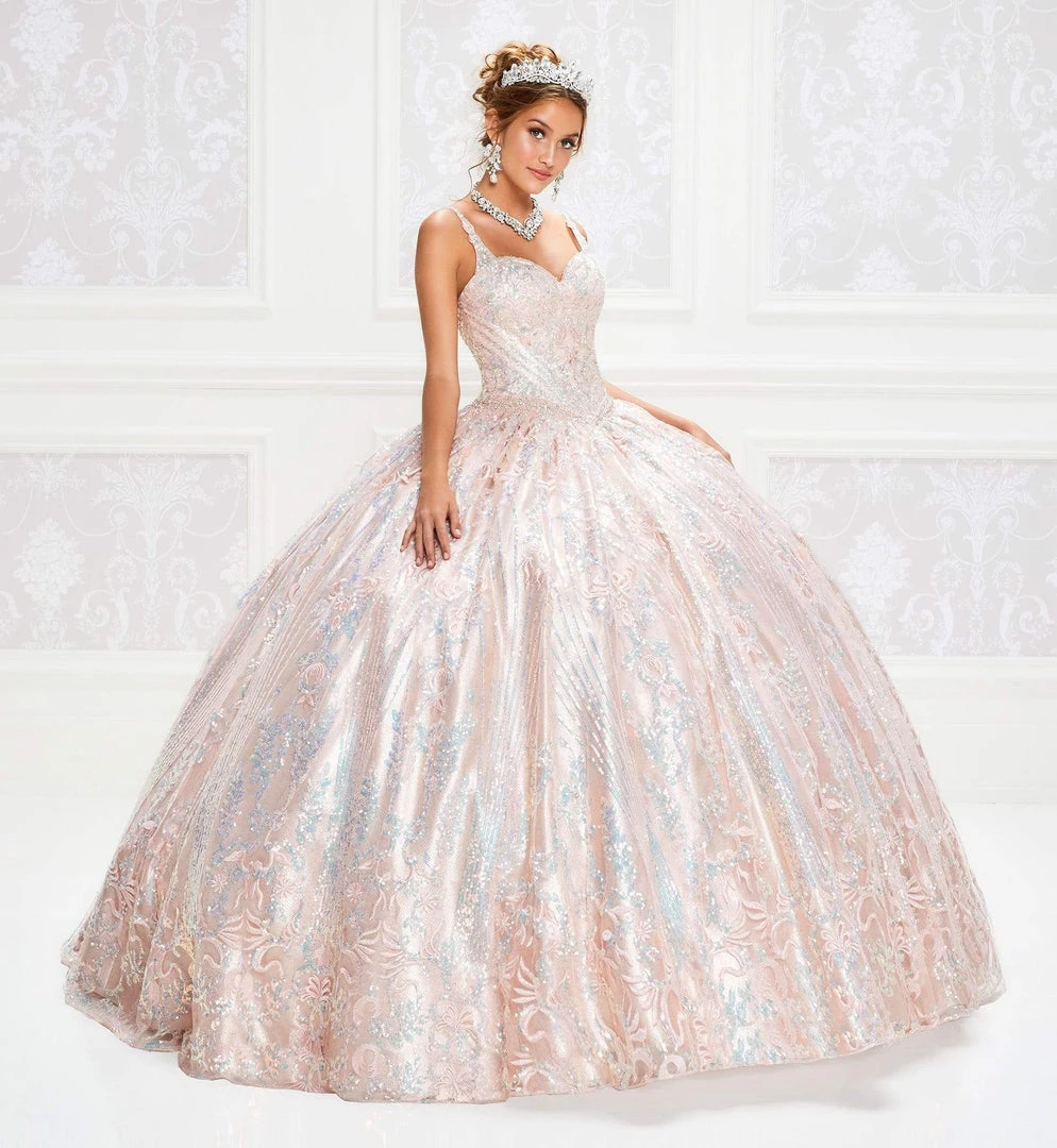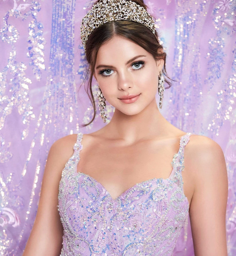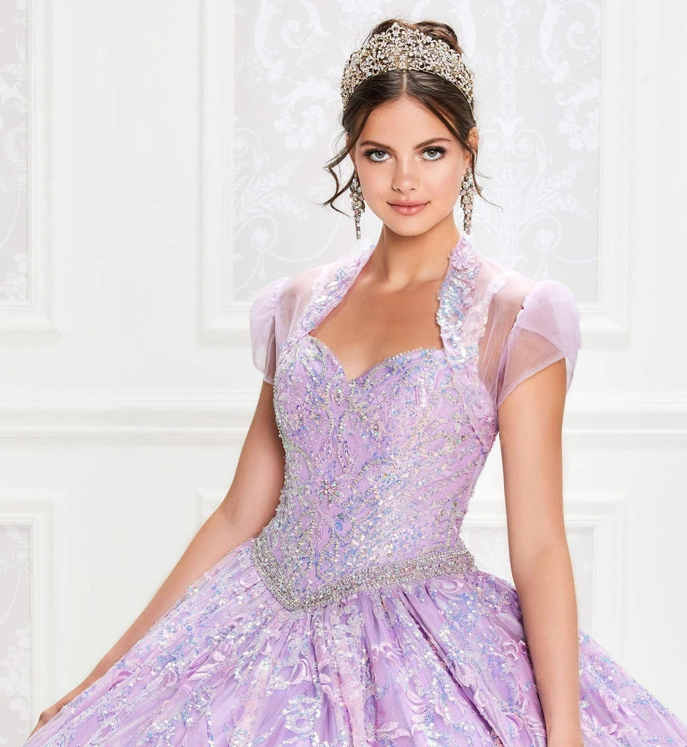 Turn yourself a real time princess with this stunning Princesa by Ariana Vara PR12009 masterpiece. Gorgeous contrasting lace appliques fashion the whole ensemble as they will make you shine all night long. Form the basque waist reveals a gathered ballgown skirt which finishes to a full length hemline. Completed with a corset laced-up back. This dress comes with a matching jacket. Optimize the attraction of your special event in this alluring Princesa by Ariana Vara creation. Find more quinceanera dresses!
