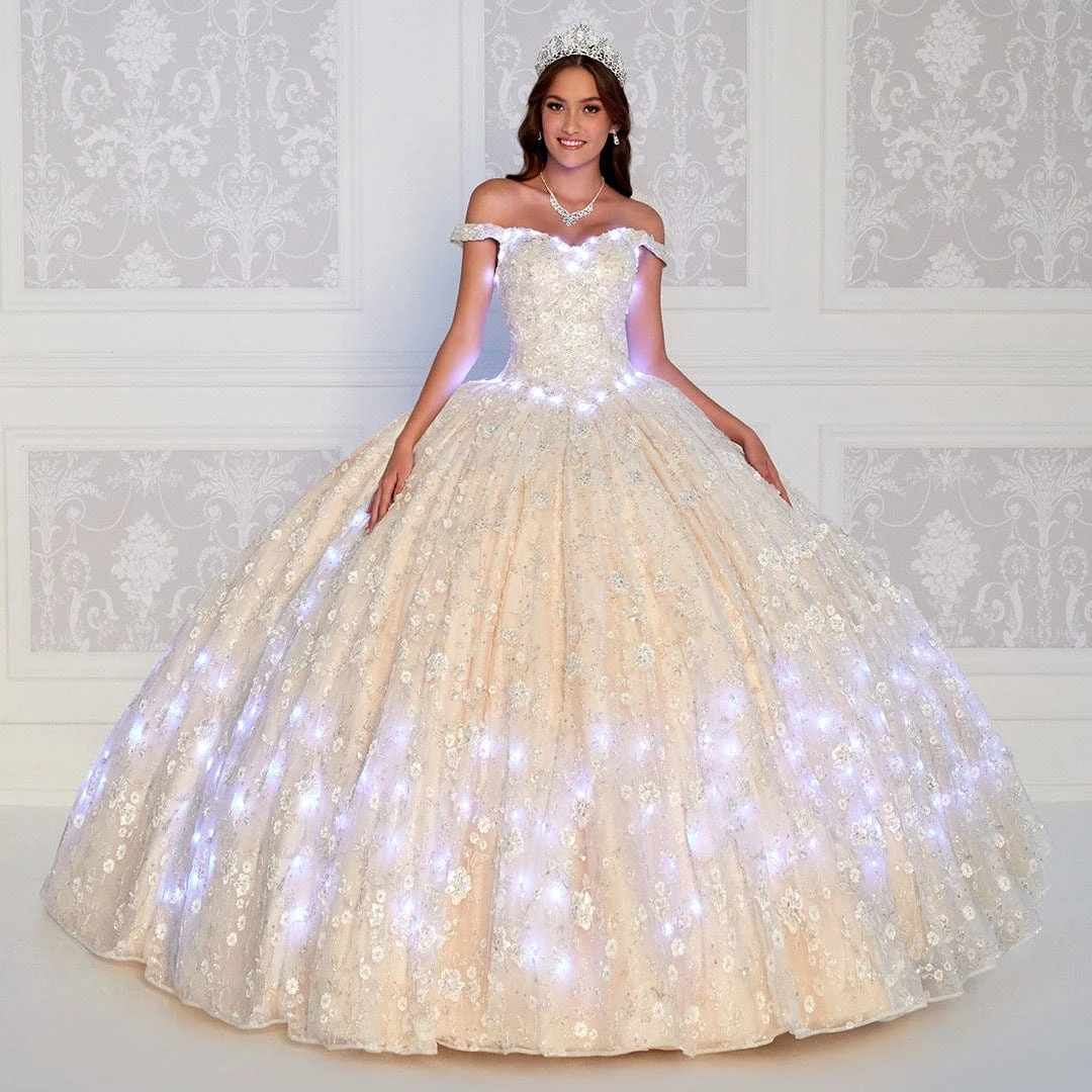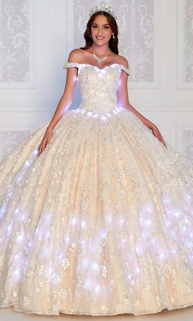 Stunningly beautiful, you will be a star in this Princesa by Ariana Vara PR12266. This ball gown brandishes a 3D floral applique on a tulle and lace fabric with an off shoulder straps on a sweetheart neckline. From the basque waistline comes a billowing ball gown that finishes to a sweep of train. This gown comes with a Bolero Jacket and Lights. Waltz into the party and feel like a queen in this Princesa by Ariana Vara. Whether your style is modern trendy or timeless classic, Mon Cheri will clothe with poise, elegance and grace for your momentous occasion. Model is wearing Ivory / Champagne color.