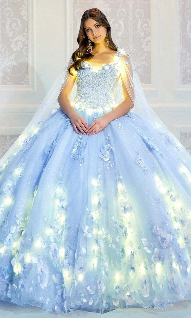 | Details: | 3D Floral Appliques, Fitted, Stone and Pearl Embellishments, Detachable Cape, Full Length, Lights included (Batteries not included due to shipping restriction) |