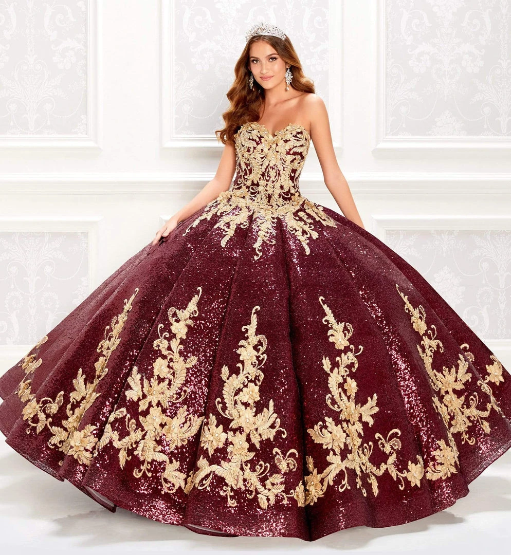 Make your grand entrance in Princesa by Ariana Vara PR22030. This novelty sequin ball gown features a sweetheart neckline, lace appliques and beading on the neckline, basque waist, corset back, horse hair hem designed with stone accents throughout. Matching sequin jacket included. This Princesa by Ariana Vara creation is simply captivating! Model is wearing Wine/Gold color.