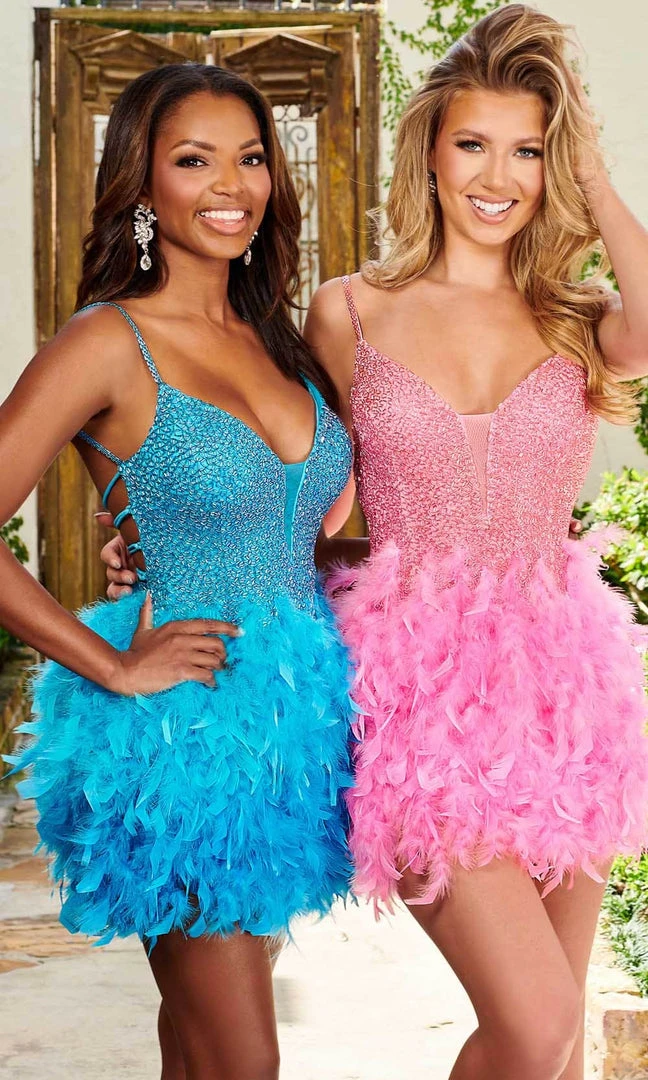 Look arresting at your stunning soiree in this highly chic Rachel Allan 40186 creation. Flatteringly designed with tailoring lines and festooned with bugle beads, this piece flourishes a plunging v-neckline with a tonal illusion inset. Showcasing spaghetti straps and an open back with lace up details, the feather ornate skirt sculpts into a sheath silhouette and ends with a mini hemline. Get noticed among the fashionable crowd in this Rachel Allan masterpiece. Models are wearing the Pink and Blue Ombre colors.