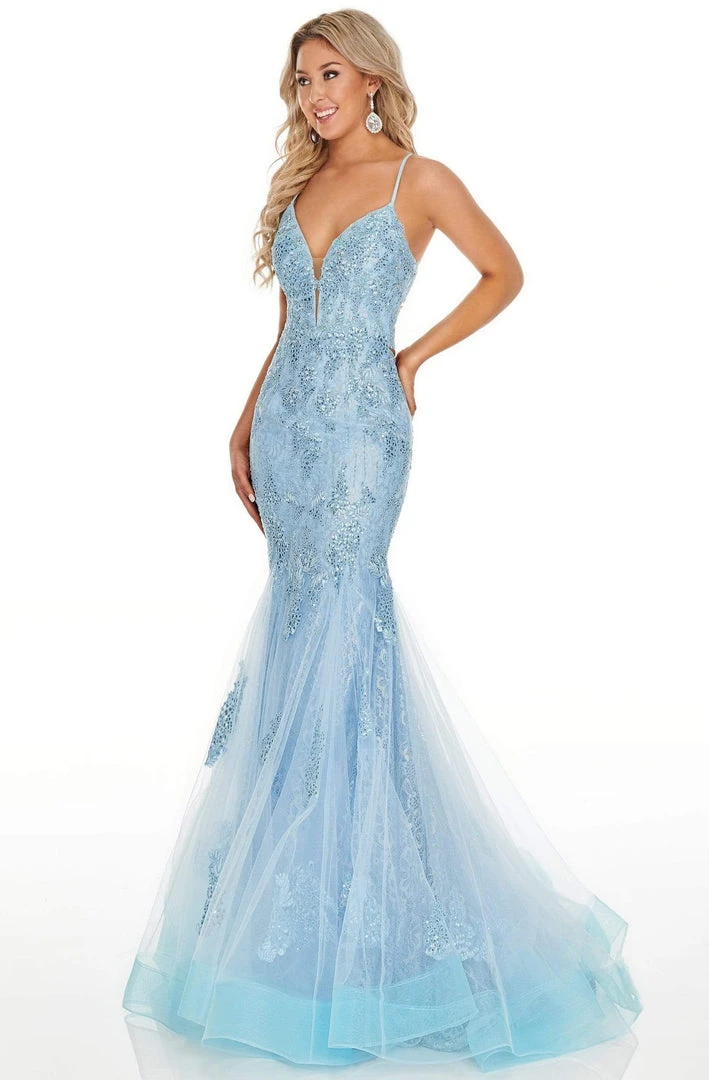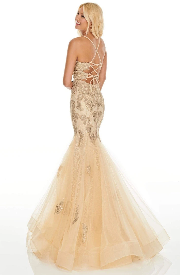 Step foot into the night wearing this elegant dress by Rachel Allan Prom 7150. Looks alluring in a sleeveless, deep v-neckline with spaghetti straps. The dress has a fitted bodice and a strappy back. The mermaid skirt highlights your curves and finishes in a horsehair hemline. Look your absolute best and create a night that you will never forget wearing Rachel Allan Prom.