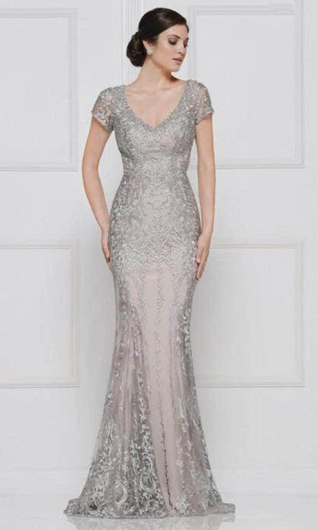 This lace gown charms with a plunging V-neckline and short sleeves. The fitted bodice highlights your curves and from the waist begins a full length trumpet skirt with a sweep train finish. Model is wearing the Slate Blue color.