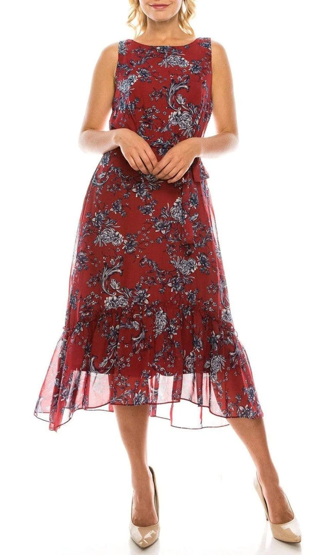 Be like a breath of fresh air when you glide with flair in this Sandra Darren 73103 creation. Exuding a vintage chic vibe with its floral printed silhouette, this dress shows a bateau neckline and a full back on a sleeveless bodice. A self-tie sash nips the natural waist for that gorgeous fit. The tea-length skirt skims down from the hips and ends in a charming lettuce-trimmed tier. Look like a brilliant spectacle at your event in this Sandra Darren masterpiece.