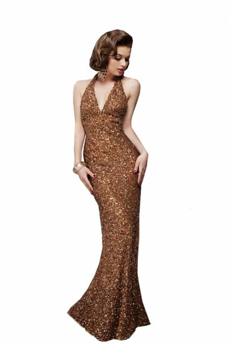 Get that enchanting look with Scala Couture 47630. This luxurious wedding gown features a V-neckline with haltered straps. The fitted bodice leads a slim skirt at floor length hem. Sequins cover the bodice for a look that is vibrant and full of texture.