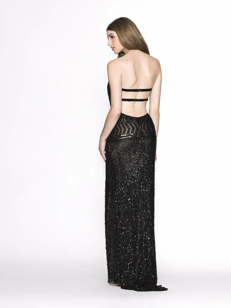 Color: Black/Nude Wow and amaze in this incredible evening dress from Scala 47659. The strapless bodice has a slight sweetheart neckline and will wrap your shape in twinkling sequins to the low hip. A contrasting belt sparkles and leads to the slim fitting full-length skirt. A dazzling side slit and chic train complete this enchanting prom style.