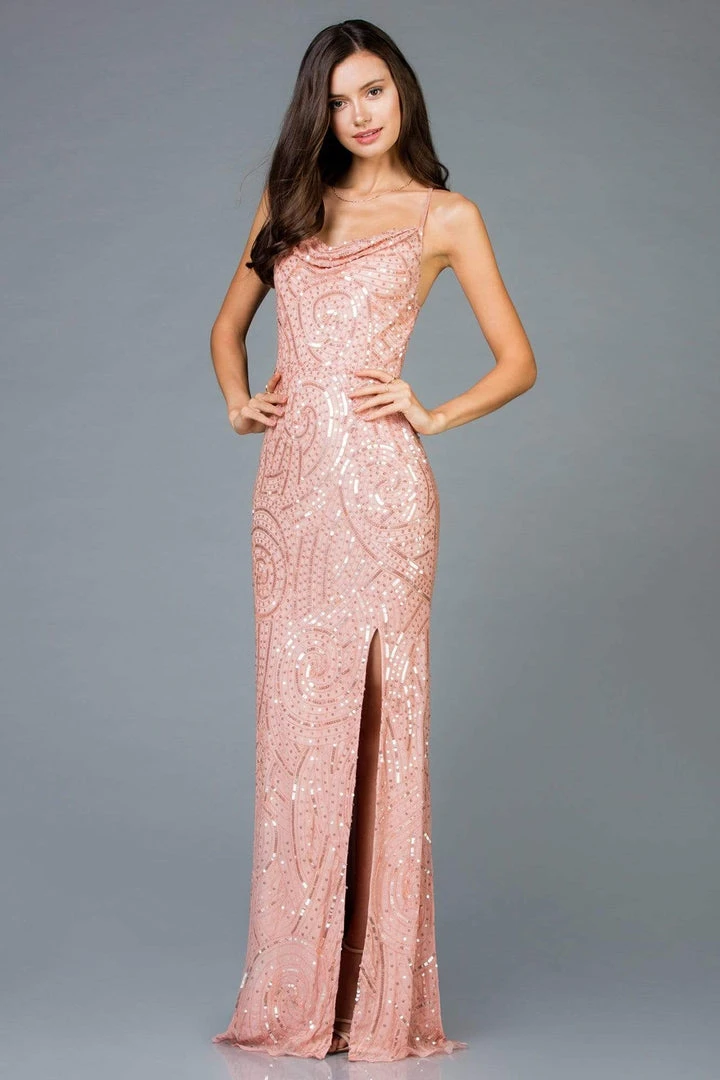 Look brilliant for the big party as you don this design by SCALA 48980. Presents in a sleeveless, V-neckline with a form-fitting bodice and a cross open back. Designed with glittering sequins and beading, the dress flourishes a fitted silhouette in full length hem and finishes in a mini train. Make a memorable splash at your upscale evening in this lux formal dress by SCALA.