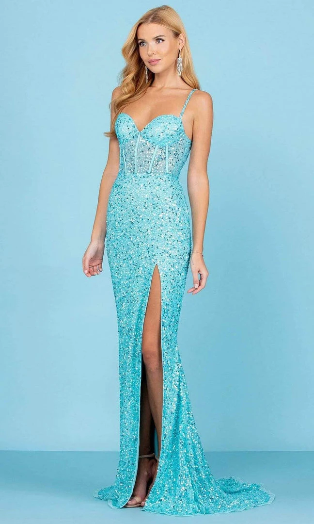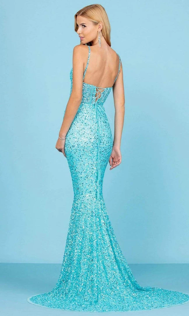 You will never cease to amaze in this SCALA 60284 creation. Detailed with twinkling sequins allover its length, this gown features a corset bodice with a sweetheart neckline and spaghetti straps. The back is defined with a lace up back. Opening with a slit, the glittering skirt traverse to the floor with a train. Fall for the very romance of this impeccable SCALA masterpiece. Models are wearing the Petal, Turquoise and Strawberry colors.