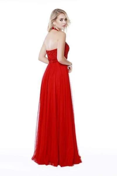 This stunning dress showcases an embellished halter v-neck bodice and an open back. It also features a matching embellished waistband detail that enhances your waistline while sheer layers flare out from the waist down to form a full gathered skirt that reaches the floor.