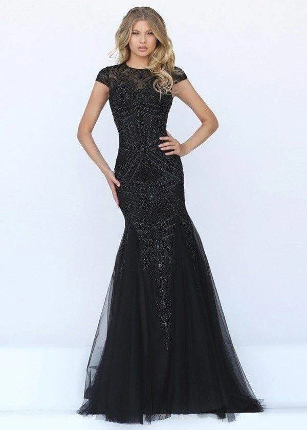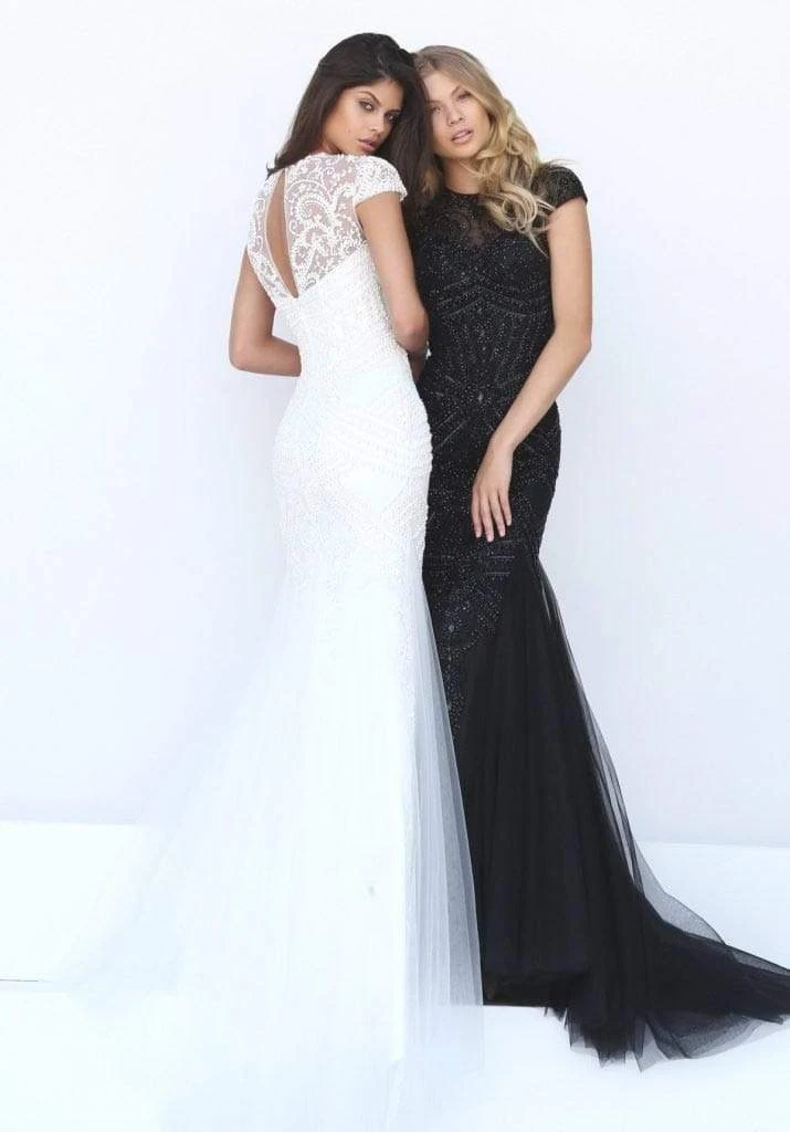 Make everyones jaw drop when you cross the threshold of the ballroom in this magnificently rendered Sherri Hill 50516 creation. Spectacularly embellished with geometric pattern of beads, this stunner shows off a sheer décolletage with illusion jewel neckline, cap sleeves and reveals a keyhole cutout at the back. The exquisitely sculpted styled mermaid skirt features sheer tulle godets stream down to brush the floor with a full-length hem. Be at the center of the limelight when you sparkle with elegance in this Sherri Hill masterpiece.