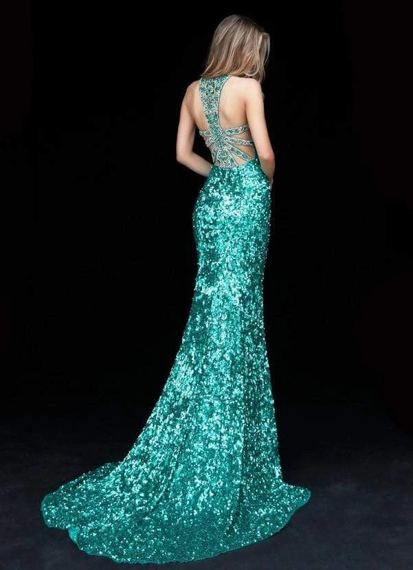 Get on the best-dressed lists in this lavish dress from Sherri Hill 51663. This sequined dress features a sleeveless, halter neckline with fitted bodice designed with back cutouts. The full length skirt forms a trumpet silhouette and finishes in a sweep train. Traditional style gets a glam twist in a sophisticated dress from Sherri Hill. Model is wearing the Emerald color.