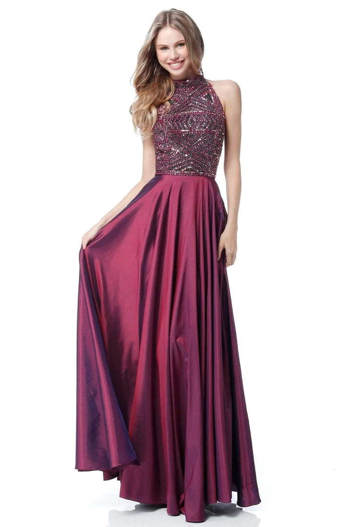 Bring about the glamour as you reap compliments in this Sherri Hill 51690 creation. Crafted with a glistening geometric beaded cut-in bodice, this stunner shows a high halter neckline paired with a slender racerback detail. The lush taffeta skirt flutters into a sleek full-length hemline. Get crowned as the belle of the ball in this Sherri Hill masterpiece. Models are wearing the Jade, Peacock, Red and Ruby colors.