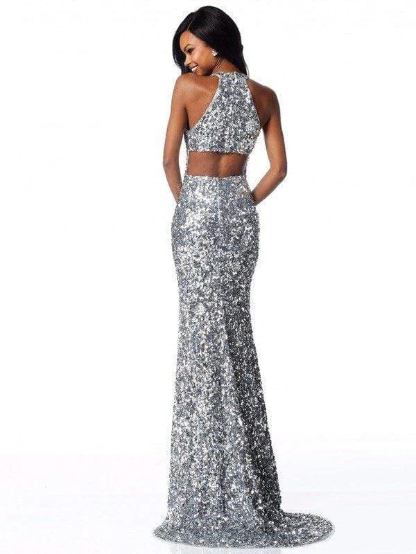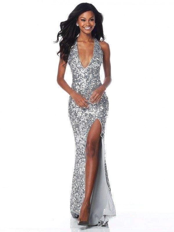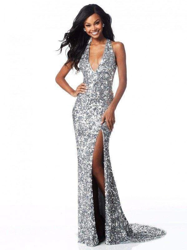 Celebrate a night of sophistication as you surround yourself in glamour in this classy evening dress by Sherri Hill 51785. This allover sequin gown features a deep plunging V-neckline in a halter style fitted bodice with a cut-out detail at the back. Performing a figure flattering silhouette, the dress is cinched at the natural waist, while the skirt defines the curve of the thighs and flares at the thigh-high slit as it perfectly falls onto the floor with a puddle train. Shine your brightest as you reap compliments in this Sherri Hill creation.