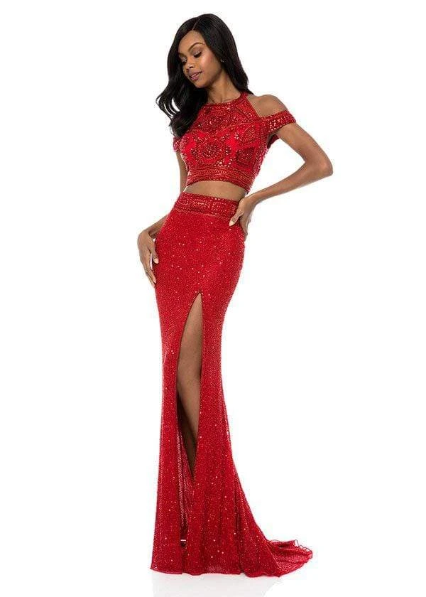 Enter the party and do that walk of a regal beauty in Sherri Hill 52009. Adorned with embellishments, this two piece ensemble is tailored in a halter neckline with cutouts. The skirt forms a fitted silhouette and is detailed with a slit and a sweep train finish. Mesmerize the crowd with your sophisticated flair in this Sherri Hill masterpiece. Model is wearing Ivory/Silver color.