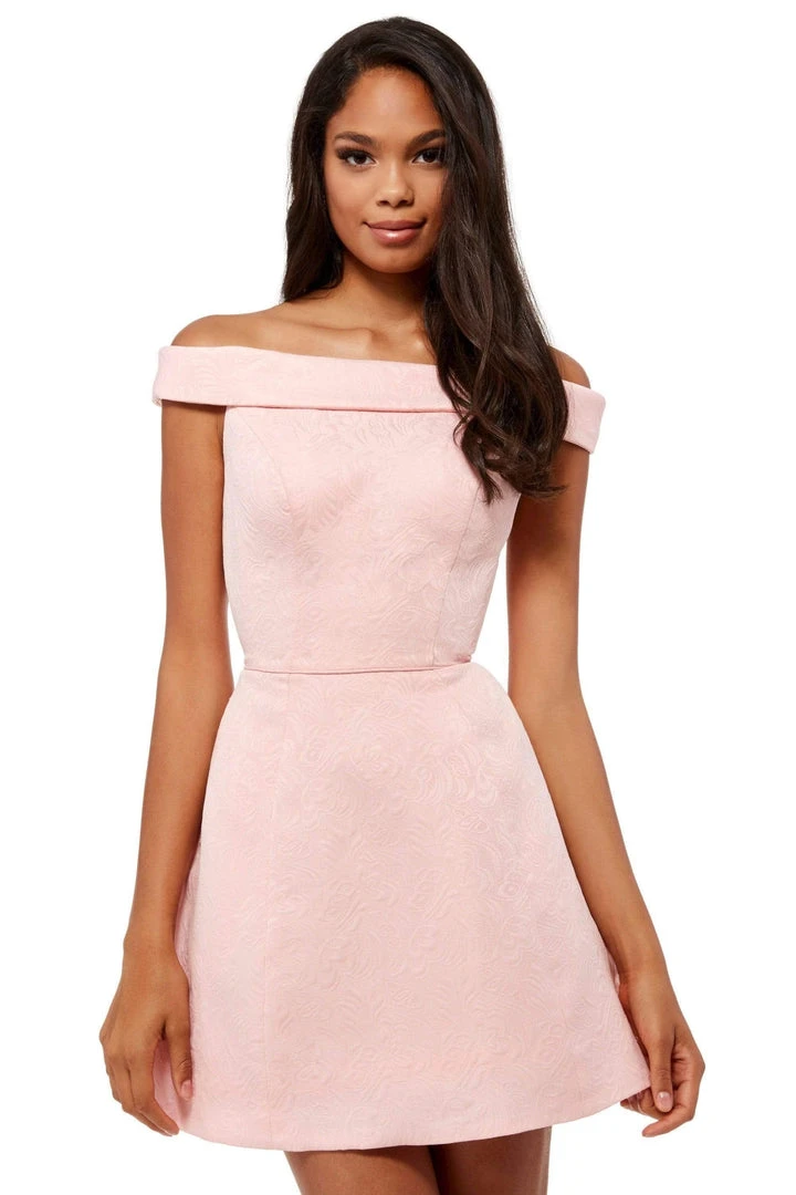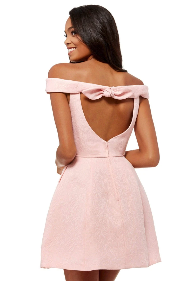 Glow with the class and feminine flair in this Sherri Hill 52336 creation. Tailored with curving lines in lovely embossed brocade, this stunner shows a foldover panel embracing in an off shoulder neckline. Constructed with a mid-open back, a half moon cutout and a bow, a simple seam defines the waist. The softly flared skirt forms a short hemline. Look like a total stunner in this Sherri Hill masterpiece. Models are wearing the Blush and Red colors.