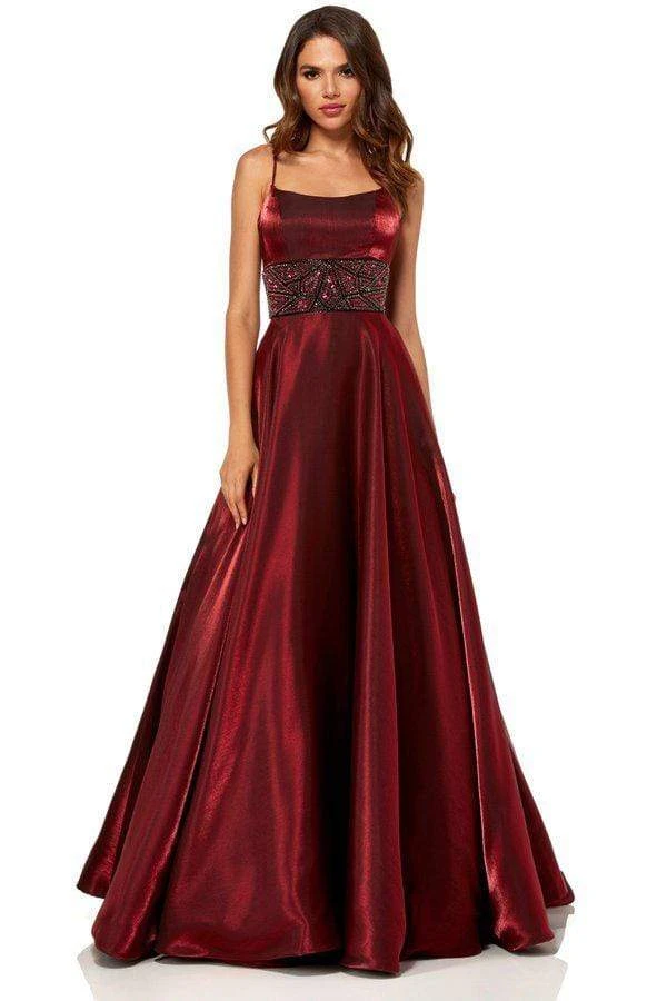 Dare to express yourself in this brazen gown from Sherri Hill 52423. Fashions a sleeveless, scoop neckline with spaghetti straps supporting the fitted bodice. The waist is wrapped in a beaded band and flourishes a ballgown skirt with a sweep train finish. Dress to the nines in this glam style by Sherri Hill.