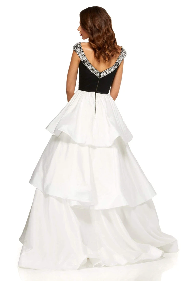 | Details: | Cap sleeves, Beads, Satin bodice, Fitted, Long A-line gown, Tiered skirt, V-Back, Back zipper, Court train |