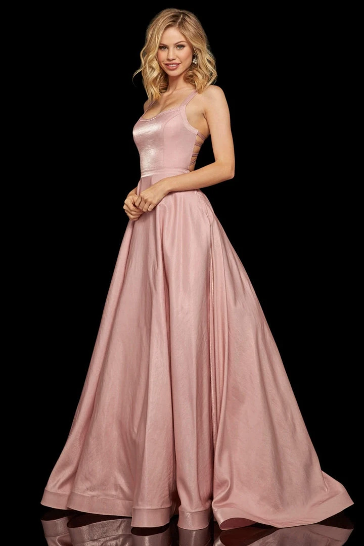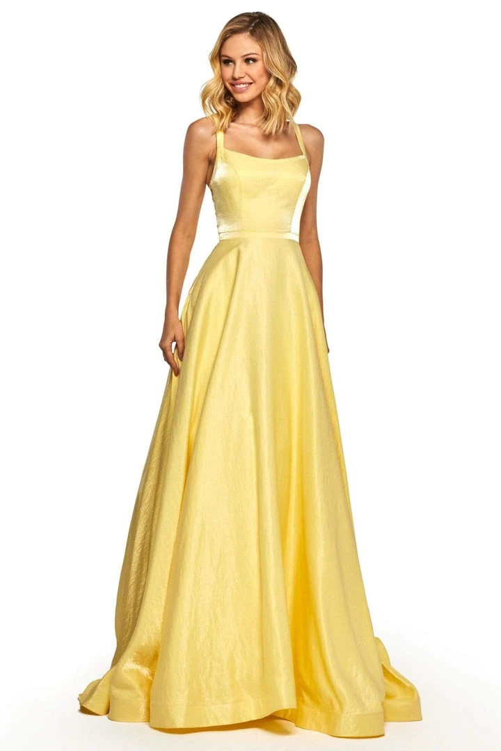 Appeal to everyone with the stunning sophistication brought by this Sherri Hill 52457 creation. Sleekly sculpted with seams, this beauty shows a scoop neckline hanging from thin straps. Showcasing an open back with a strappy bandeau design, the A-line skirt is cinched with a thin belt before draping the floor with its sweeping train. Render them speechless in this Sherri Hill masterpiece.