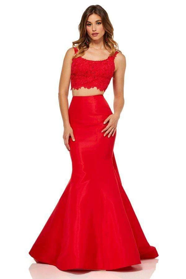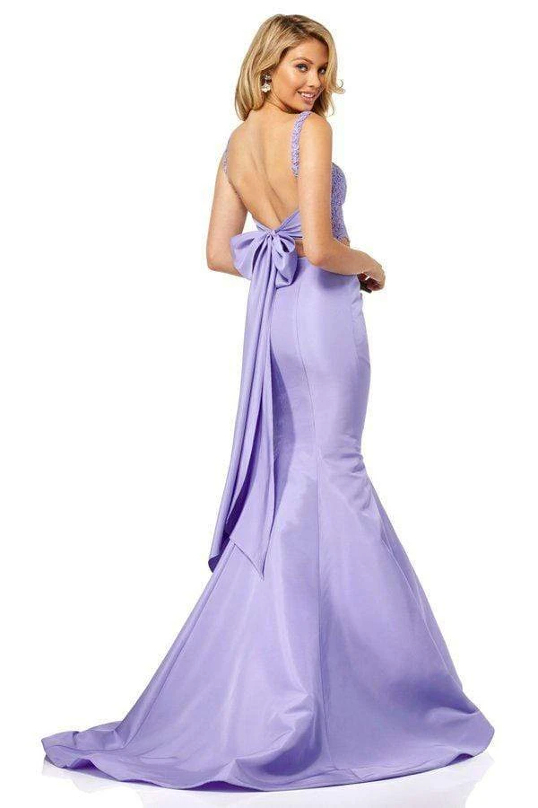 Showcase your fashionable sense of style in this wonderful Sherri Hill 52528 evening dress. This chic masterpiece showcases a lace crop top with scoop neckline, thick straps and hand tied taffeta bow back. Tailored is stretch taffeta fabric, the princess seamed mermaid skirt reveals a stunning back train. Turn heads effortlessly with this Sherri Hill creation.