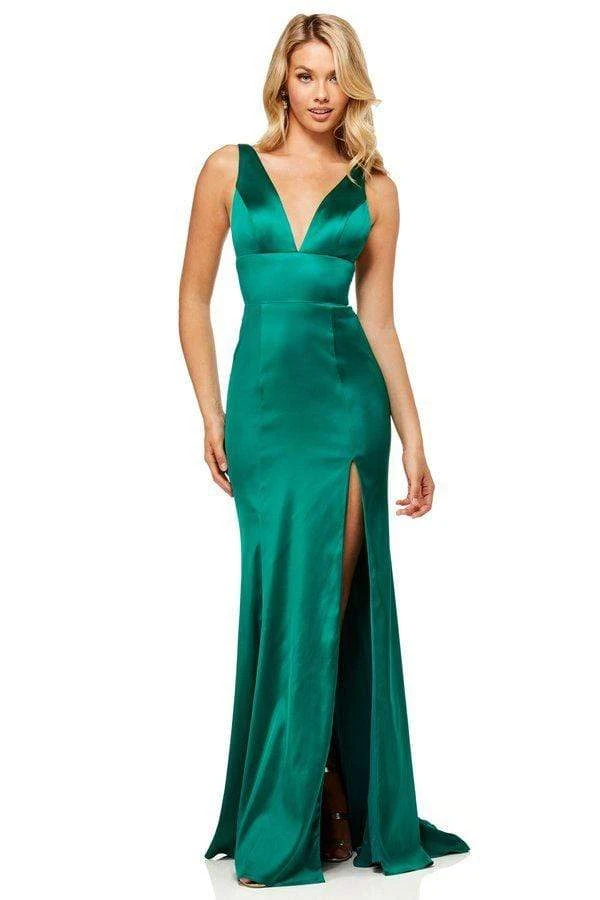 Embrace a classic sense of style in this engaging evening gown by Sherri Hill 52549. This satin dress presents in a sleeveless, deep V-neckline with fitted bodice styled with a low V-back and a zipper closure. The skirt is tailored in a full length sheath silhouette cut with a side slit and a sweep train finish. Achieve new heights of fashion in this exquisite evening gown by Sherri Hill.